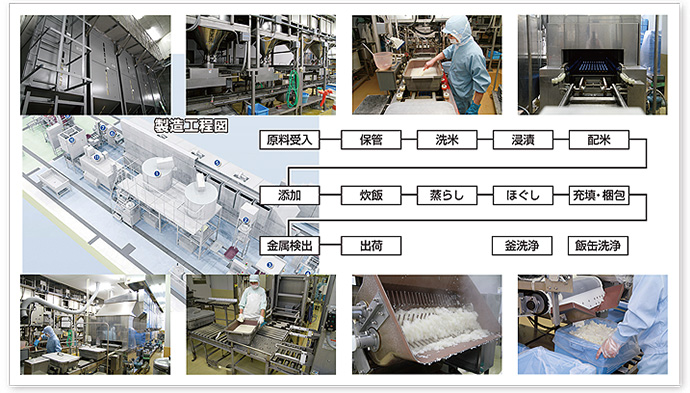 府中工場は1時間に最大90釜(1.3t)の大量炊飯が可能です。受注センターもこちらに設備されており、日々お客様の注文管理を行っております。